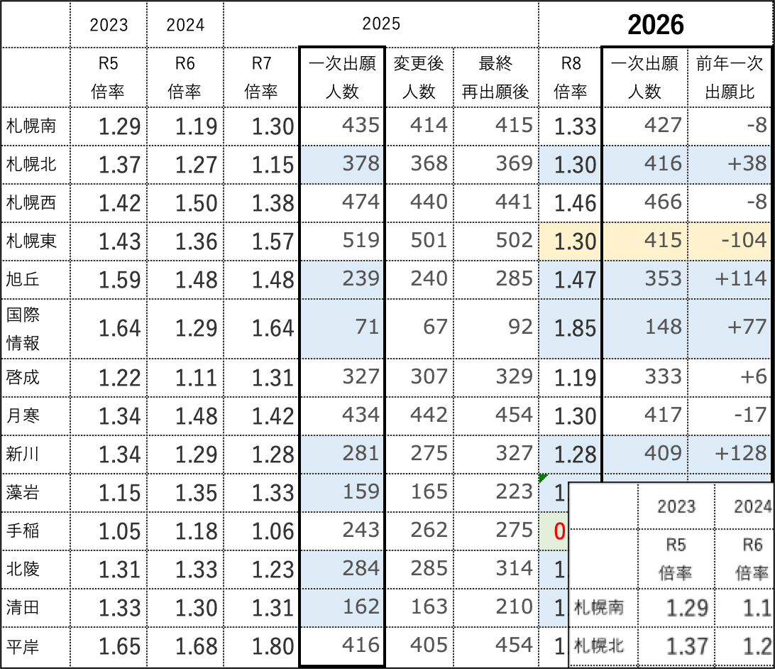 ・昨年1.80倍の超高倍率の札幌平岸は前年一次比-78名と減少し、一方で札幌藻岩(前年一次比+34)や札幌清田(同+25)などは昨年の低倍率を見て志願者が流入しています。