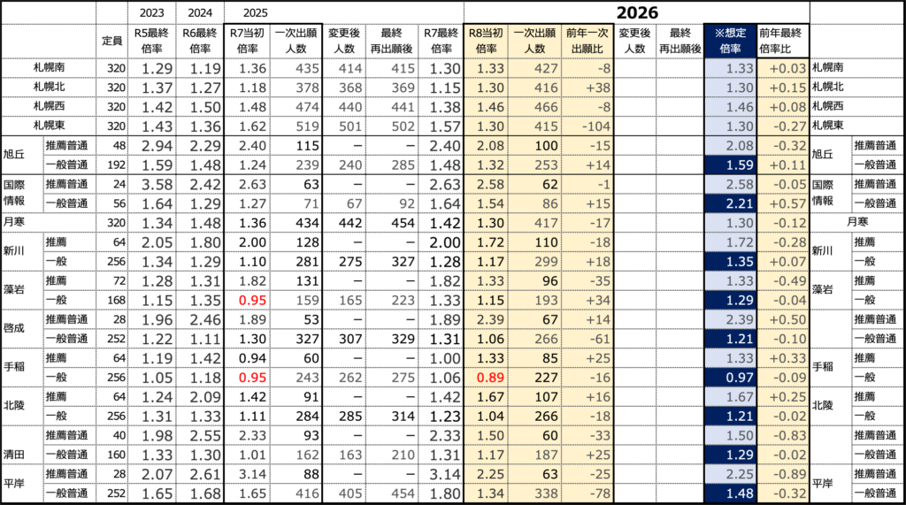 【2026】公立高校想定倍率〜当初出願者時点(札幌市内)